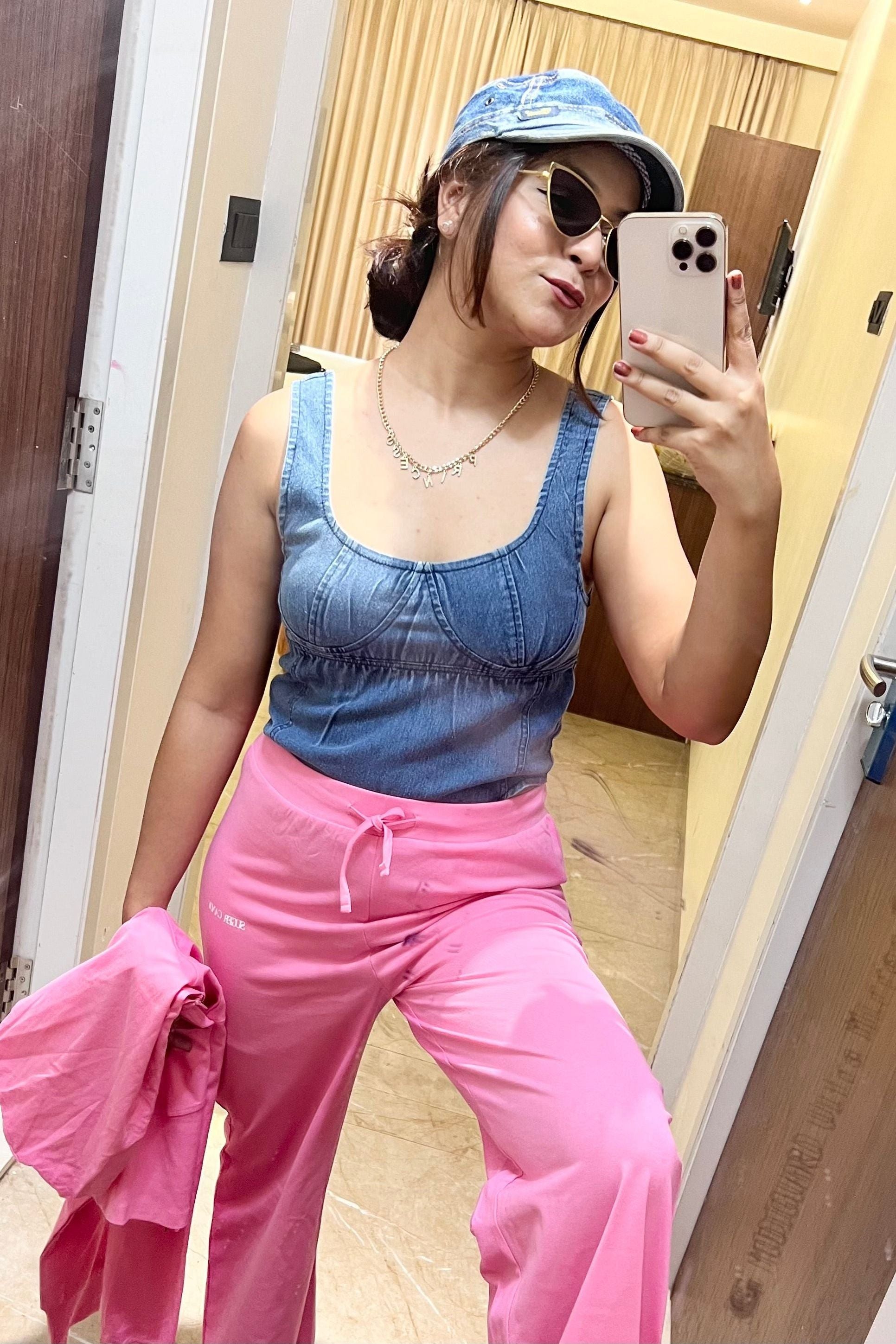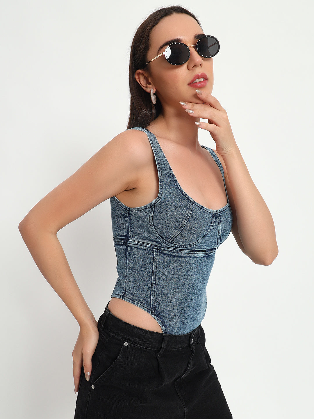 A denim bodysuit is a versatile and stylish garment that combines the classic look of denim with the sleek fit of a bodysuit. Typically made from high-quality, stretch denim fabric, it features a form-fitting silhouette that hugs the body, often with snap closures at the crotch for convenience. Perfect for layering or wearing alone, it offers a trendy, modern twist on casual wear, suitable for various occasions from casual outings to chic evening looks.