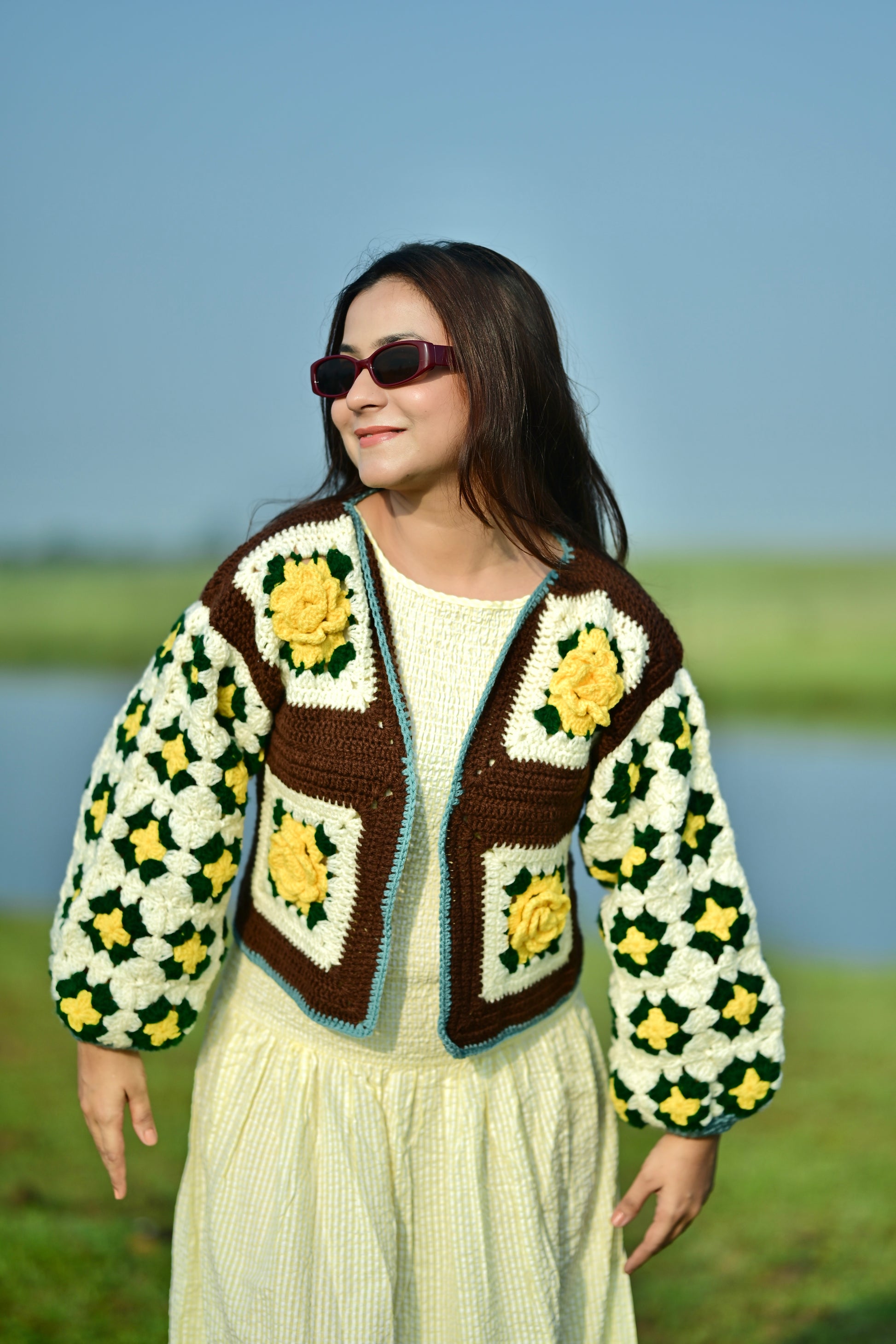 Wrap yourself in comfort and charm with this beautifully handcrafted crochet cardigan. Made from premium acrylic wool, it combines warmth, softness, and durability—perfect for all seasons. The intricate 3D floral motifs in vibrant yellow pop against the earthy brown and cream base, giving it a vintage yet modern aesthetic.